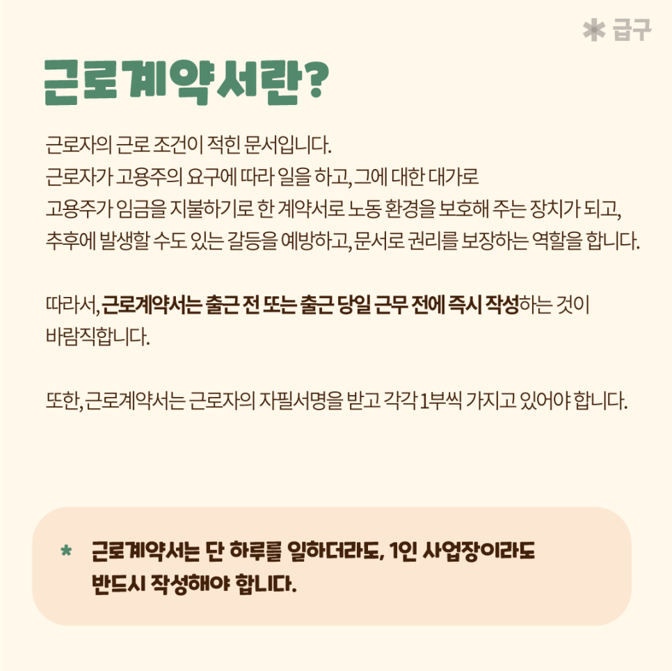 - 근로계약서 라는 문서를 통해 근로자의 권리를 보장해줄 수 있는 역할을 합니다.