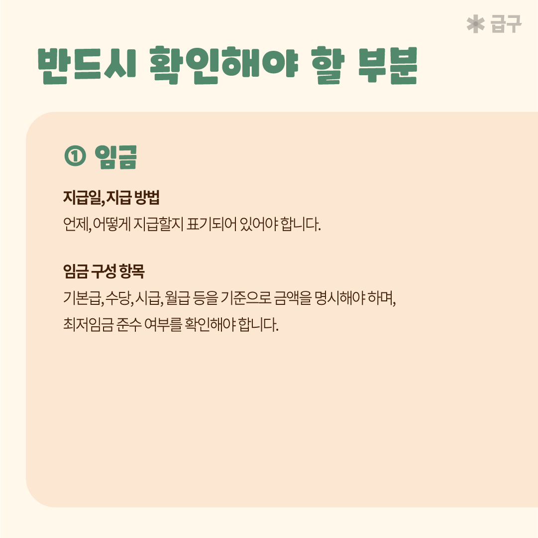 언제 그리고 어떻게 임금을 지급할 것인지 표기되어 있어야 합니다. - 임금 구성 항목