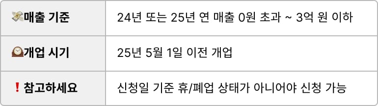 3️⃣단, 신청일 기준 휴/폐업 상태가 아니어야 하며 24년 또는 25년 연 매출액이 0원을 초과해야 합니다