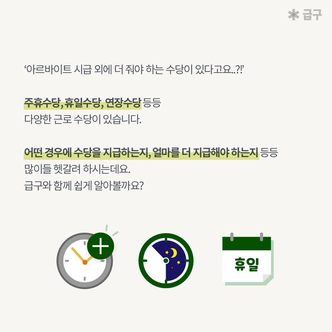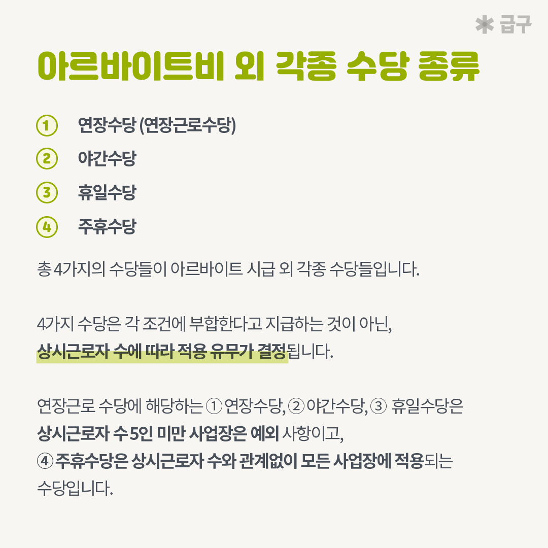 아르바이트 구하기 위해 알아야 하는 주휴수당, 야간수당, 휴일수당, 연장근로수당 조건 기준 계산 방법! 단기알바 어플 급구에서 핵심적으로 알려드려요! 사업장 상시근로자 수에 따른 적용 여부도 함께 확인해보세요.