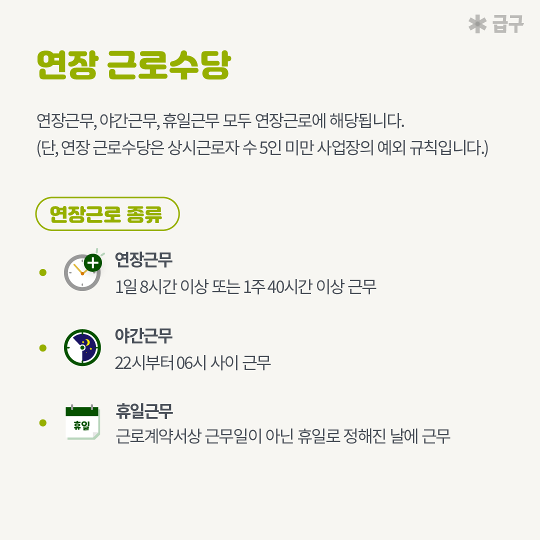 각 연장 근로 근무에 따라 지급해야 하는 수당이 연장근로 수당입니다.