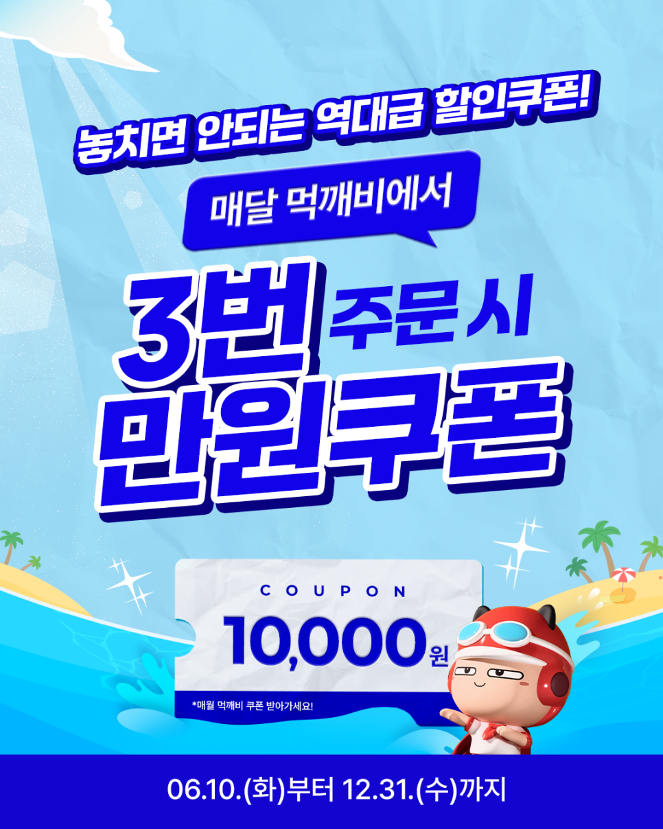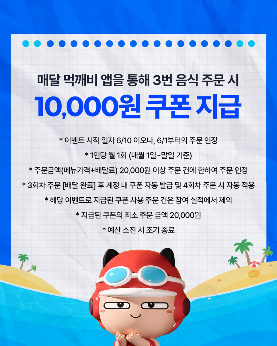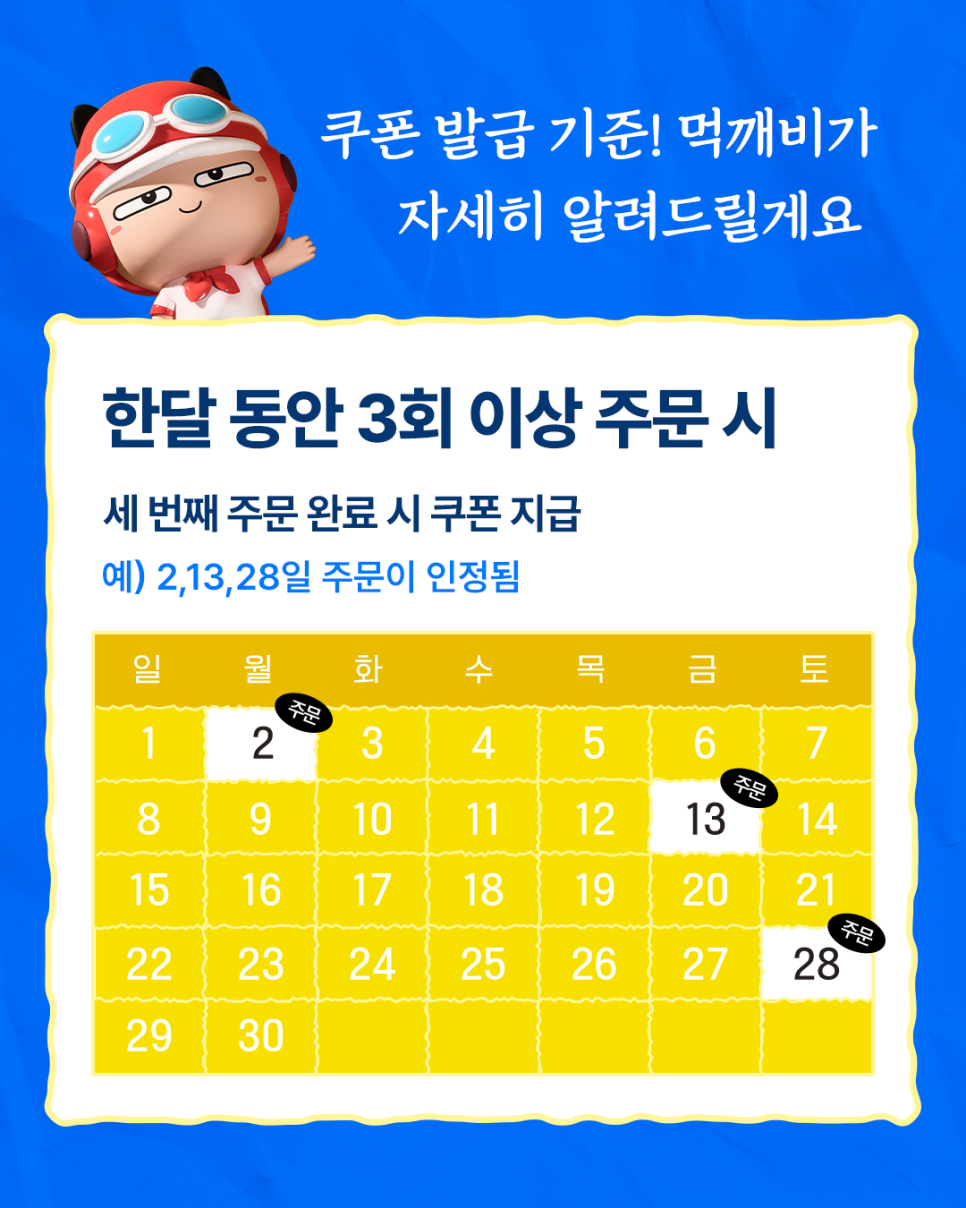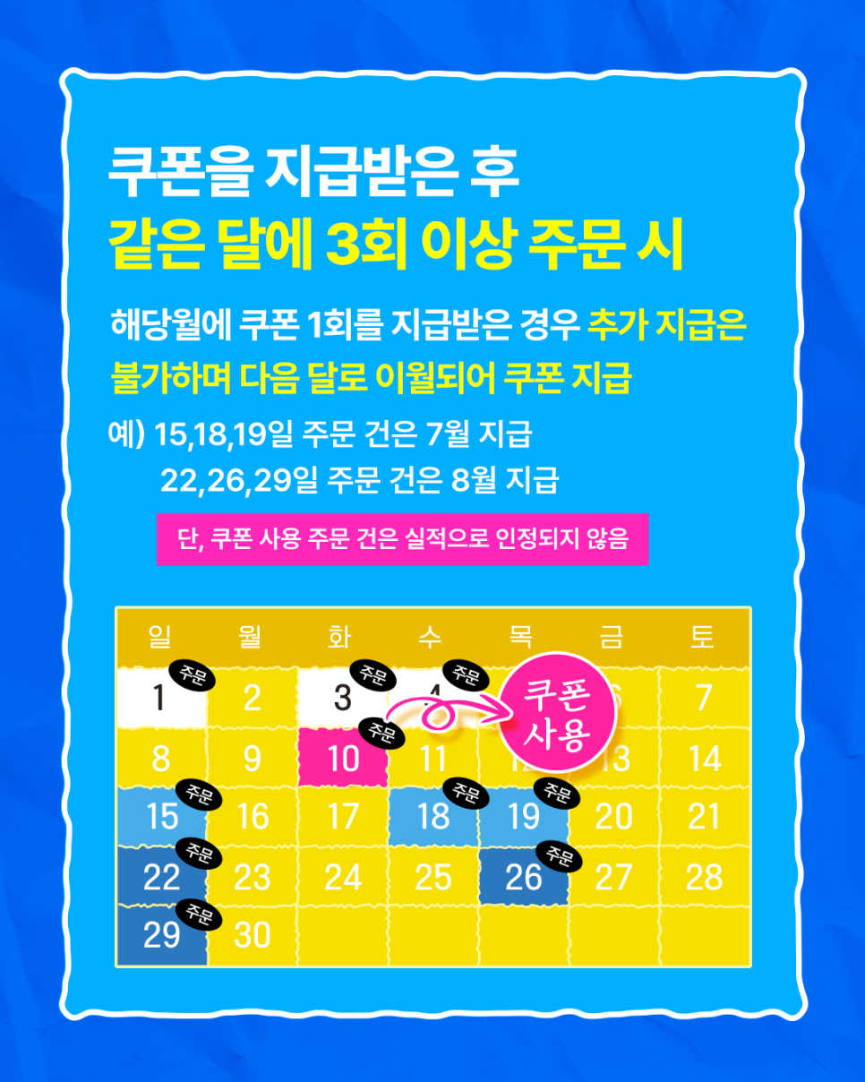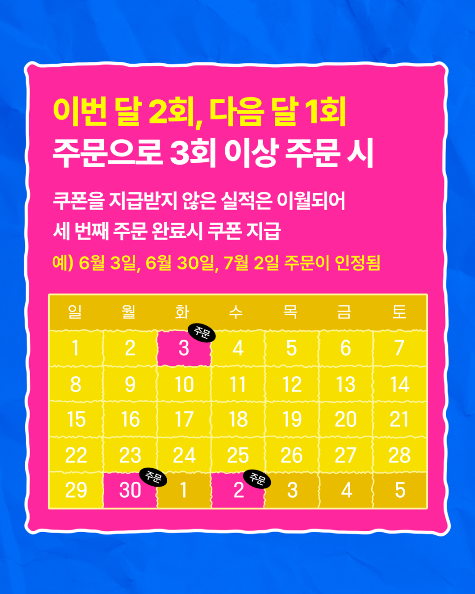 한 달에 2만 원 이상 3회 주문하면 1만 원 쿠폰을 지급하는 이벤트가 진행 중이에요