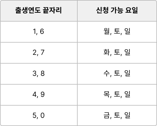 출생연도별로 신청할 수 있는 요일이 다르게 운영되고 있어요
