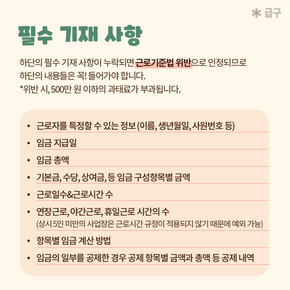따라서 하기의 필수 기재 사항들이 임금명세서에 반드시 들어가도록 유의해주세요!