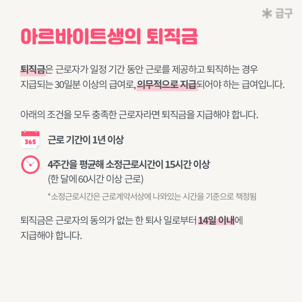 알바앱 급구에서 아르바이트 퇴직금 개념과 조건 그리고 계산 방법까지 핵심적으로 알려드려요! 알바 퇴직시 받을 수 있는 퇴직금 계산법 확인해보세요 :)