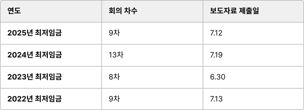 본 회의에서 결정된 최저임금(보통 7월 중순까지 의결 진행)은 고시 후 2026년 1월 1일부터 바로 적용돼요.