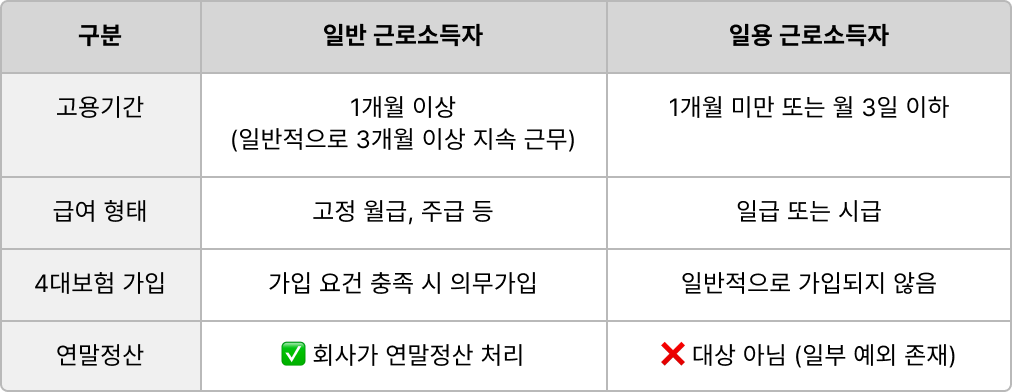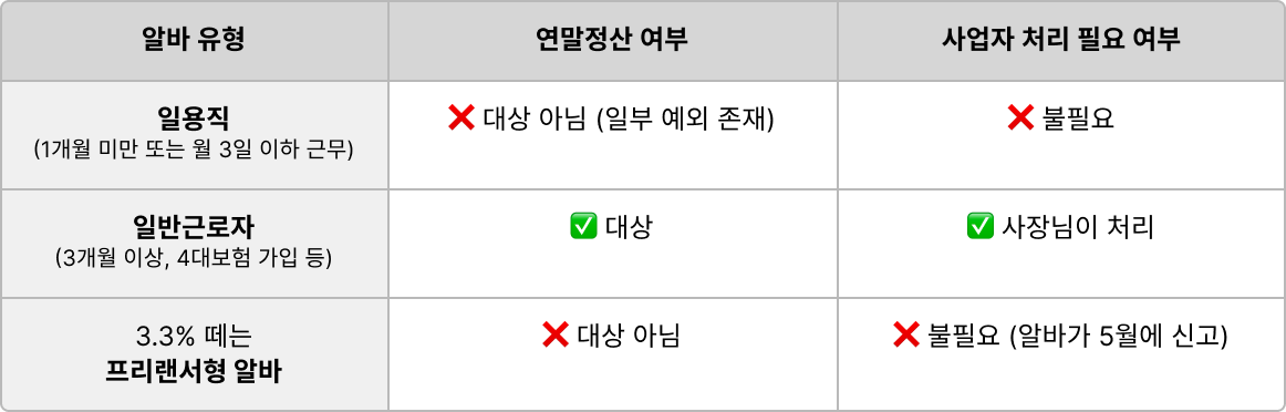 ✅ 즉, 일용직 알바는 사장님이 연말정산을 따로 챙겨주지 않아도 됩니다!